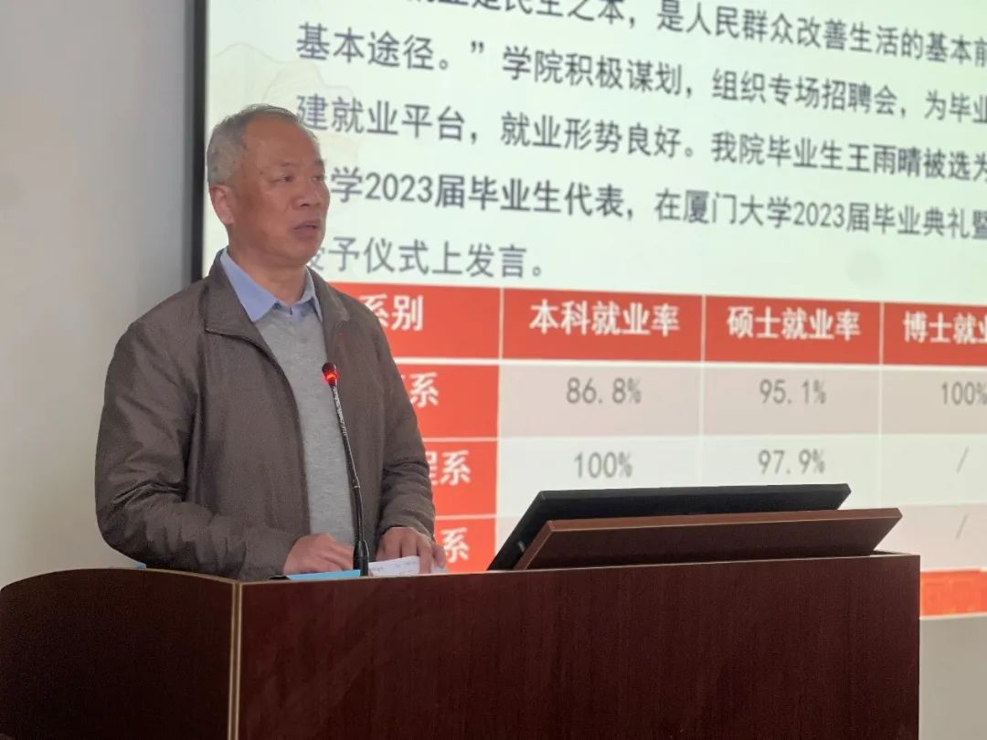 学院党委书记王绍森教授讲话。王绍森对大会圆满举行表示热烈祝贺,对全体教职工为学院付出的辛勤劳动和无私奉献表示衷心感谢。王绍森表示,学院将认真梳理代表们提出的意见和建议,抓紧落实,推进工作。王绍森希望全体教职工深入学习贯彻习近平致厦门大学建校100周年的贺信精神,坚持党建引领,促进事业发展;坚持育人为本、质量为先,落实学校第十二次党代会提出的“博学至善”行动,培养和造就具有引领性、人文性、时代性和开放性的卓越人才;坚持五湖四海选拔人才和引进人才,培养和使用好现有人才,打造“群贤竞秀”的良好局面;坚持创新驱动战略,以有组织科研推进有组织服务国家和区域经济社会发展。全体教职工要勇敢担当作为,面向未来,增强使命感、责任感、紧迫感、危机感,踔厉奋发,迎难而上,守正创新,一定会创造出更加美好的未来。