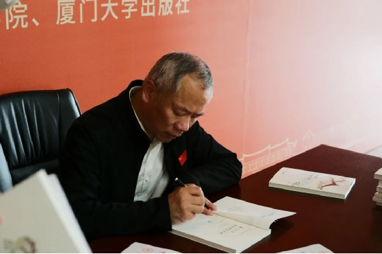 在讲座结束后的《厦门大学校园建筑赏析》新书签赠会上,同学们排起了长队,张建霖为大家写下新书寄语。