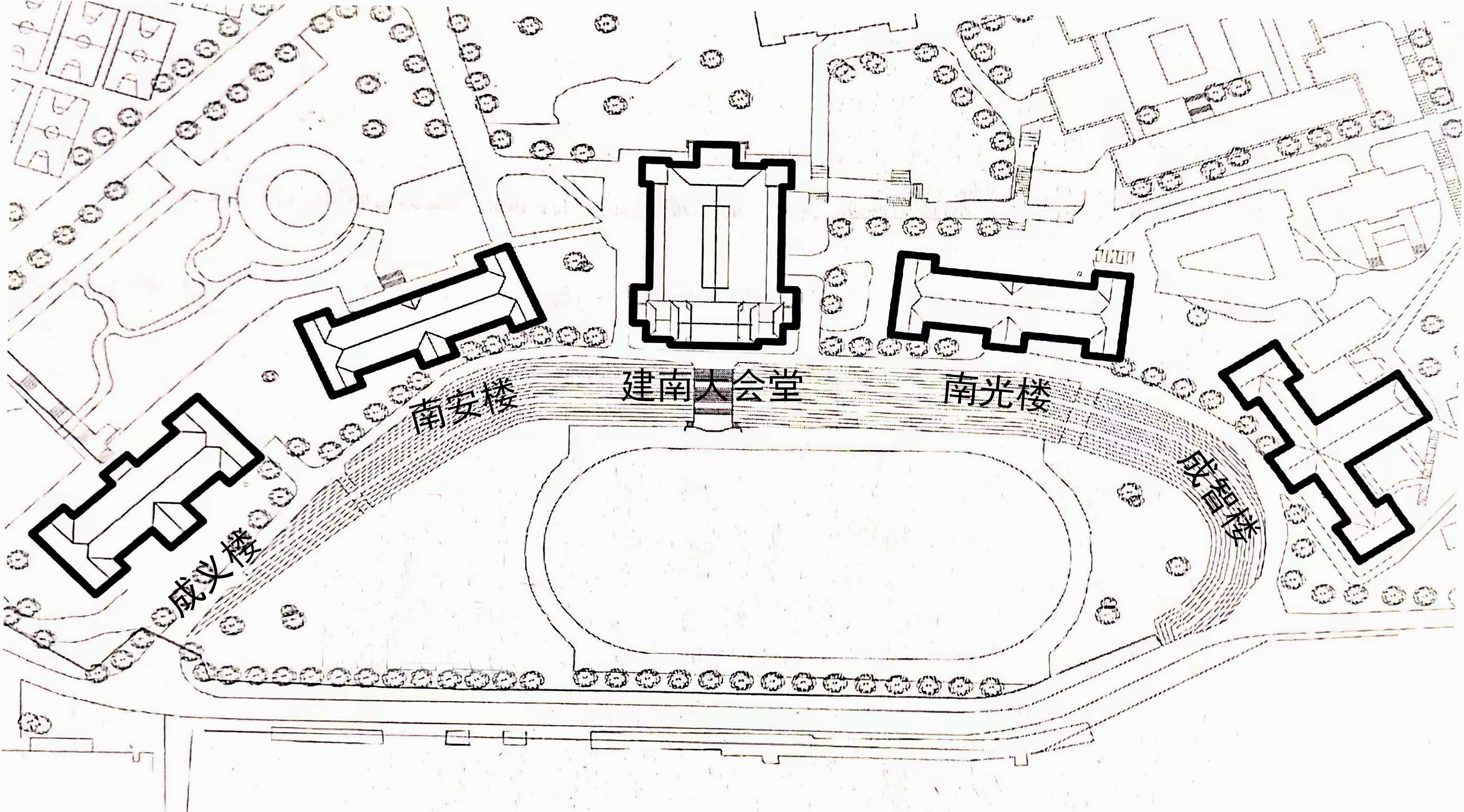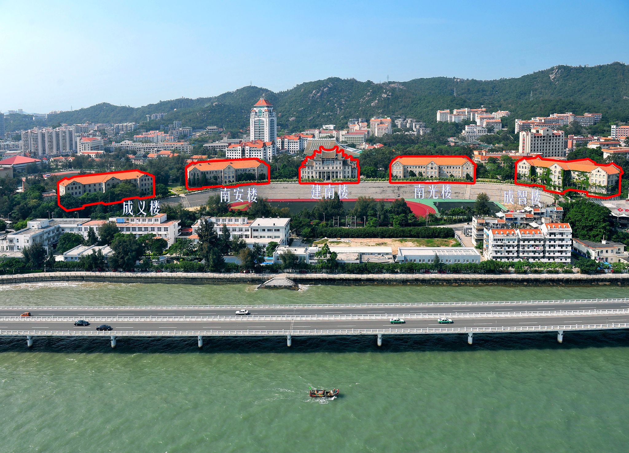 “我要让外国的轮船一进厦门港,首先就看到一座中国的大学。” 这是嘉庚先生建造建南楼群的初衷之一。建南楼群建于1951年至1954年,由“一主四从”的五幢楼组成。主楼建南楼(学校大会堂),主要用作集会等大型活动,其东侧为南光楼(时为物理馆)、成智楼(时为图书馆),西侧为南安楼(时为化学馆)、成义楼(时为生物馆)。
