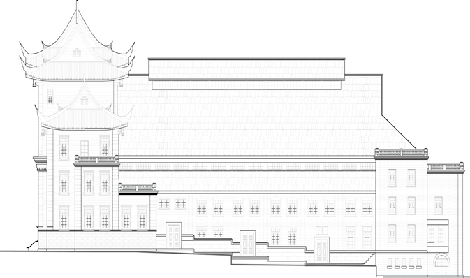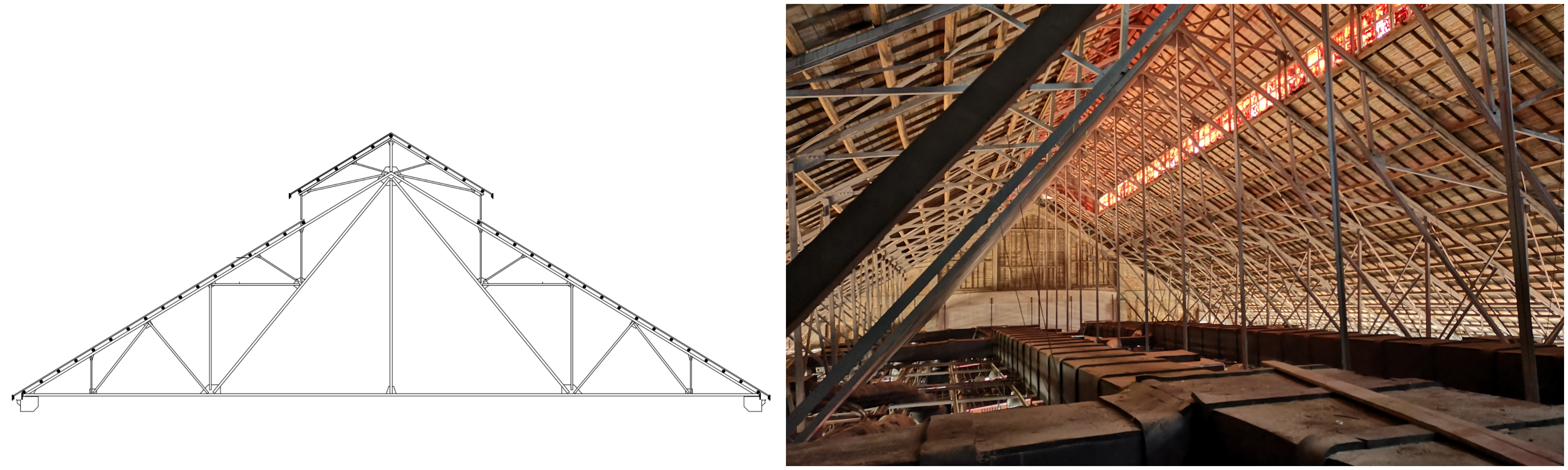 大屋顶三重檐且屋面采用红色机平瓦(即用粘土烧制而成的瓦)铺设在大屋架上,因海边风大难于确保结构安全,原人字木屋架改为钢构屋架,跨度达30米,采用芬克式桁架13榀(“榀”为量词,一个房架称一榀,钢结构中一般指由柱和梁构成的一个框架立面),每榀重5吨多。当时没有大型的机械吊装设备,桁架人工在地面组装后,采用“拖杆支撑起吊法”,由工人用特制的网兜吊至屋顶,再安装至构件上。