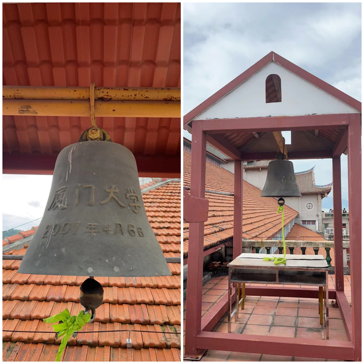 如今正在使用的钟,高挂在建南大会堂天台,是厦大八十周年校庆时所铸造的。天台并不大,长宽都只有七八步,红砖铺地,四周围着矮矮的石栏杆。钟挂在一个用铁杆支起来的棚下面,是一口厚重的黑灰色铁钟,面上雕有“厦门大学”字样以及它被铸成的日期“2001年4月6日”。钟内部悬着一个敲钟的大铁球,因为长年的撞击,铁球四周十分光滑,经年的沧桑从锈迹里渗透出来,泛着岁月感十足的金属光泽。