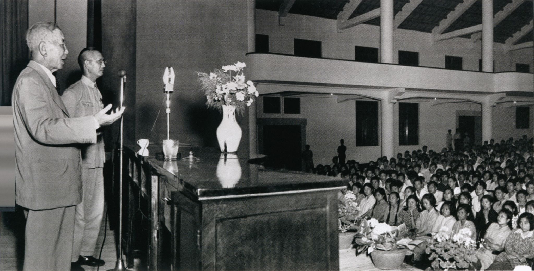 (陈嘉庚在建南大会堂举行的庆祝校舍落成典礼大会上讲话,摄于1955年06月11日)