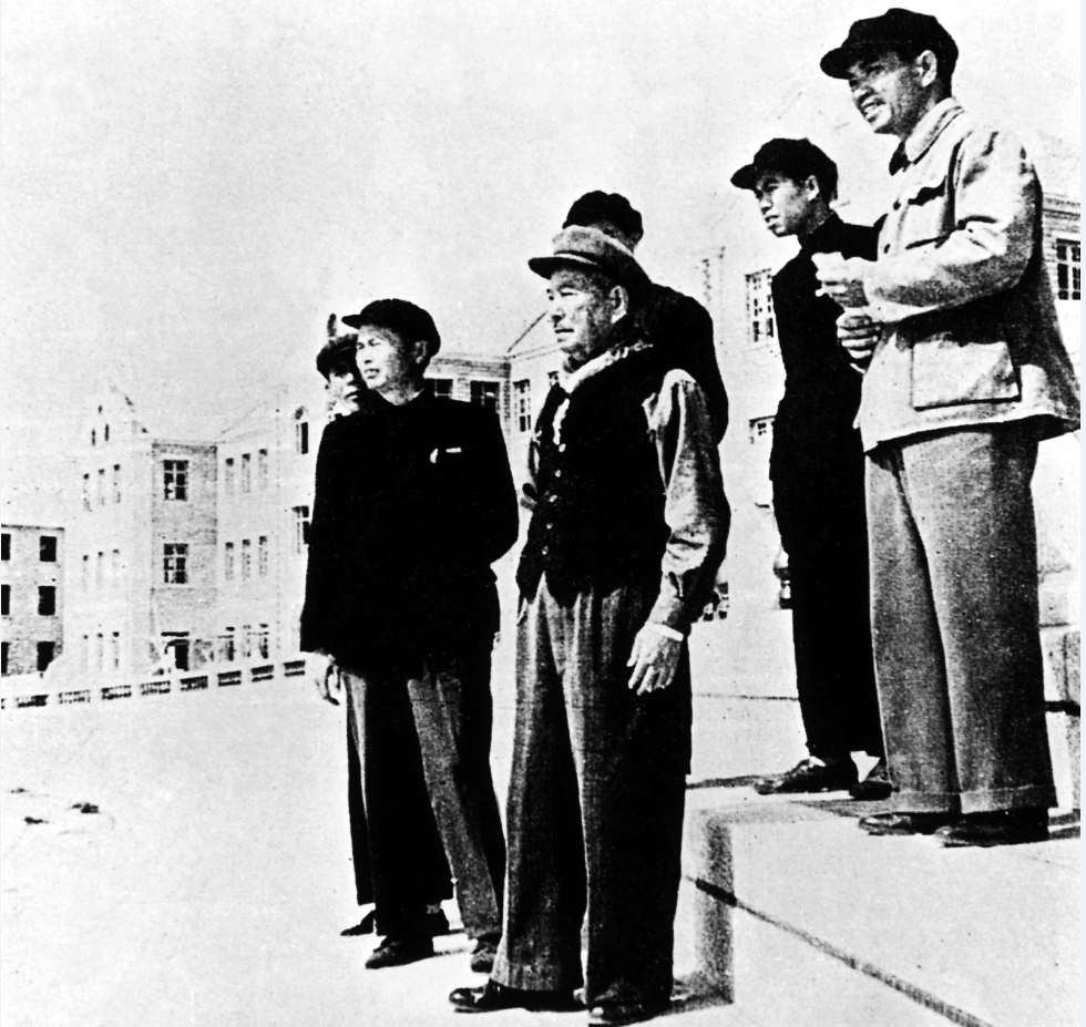 (陈嘉庚(前排右一)在厦门大学建南楼群的工地上视察,摄于1955年)