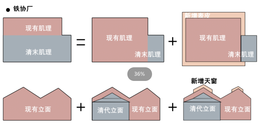 在原建筑结构外部新建类似“橱窗”的表皮,并采用模数化设计:其中立面陶砖有两种模数尺寸,分别为480×240×150和1035×240×150,以像素化搭接方式做出立面渐变的肌理;屋面玻璃采用300×600的彩釉玻璃,同样通过像素化拼贴方式做出屋面渐变的肌理。总的来说,新增的结构体系均采用工厂预制,现场安装,并且利用木纹肌理来体现“铁胁木壳”的意向,展现现代工艺的精致。