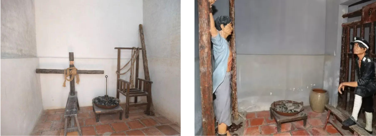 步入东侧小门,一条狭长的巷道映入眼帘。缓缓穿过巷道,便进入刑具(复制)展区:这里由一排四间砖木结构平房组成,分别为三间审讯室和一间管理室。室内狭小逼仄,仅门的斜上方开一小高窗,微弱的光线投射进来,另外采取实景再现和场景模拟等方式,在一间间“审讯室”内有老虎凳、木马椅等“刑具”。阴森的氛围让人们仿佛亲眼目睹了革命先辈被折磨的沉重历史。