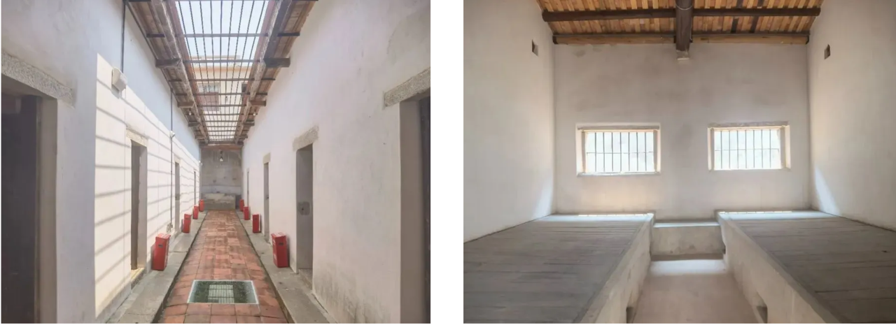 穿过北侧那扇小门,便踏入监狱实景区。这里恢复了当时的三幢牢房,前排五间、中排五间、后排十间,监狱内部的牢房十分狭小,却要关押近十名犯人。牢房内仅有单侧或双侧的砖石大通铺,犯人们只能拥挤地睡在上面。牢房的顶部梁枋结构裸露,墙面还设有带着铁栏杆的窗户,牢房内十分昏暗逼仄。即使处于这样的牢笼,革命志士们依然坚定地为了理想和信念而奋斗。