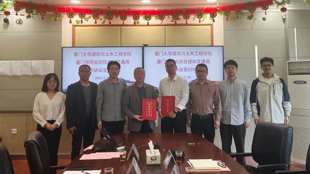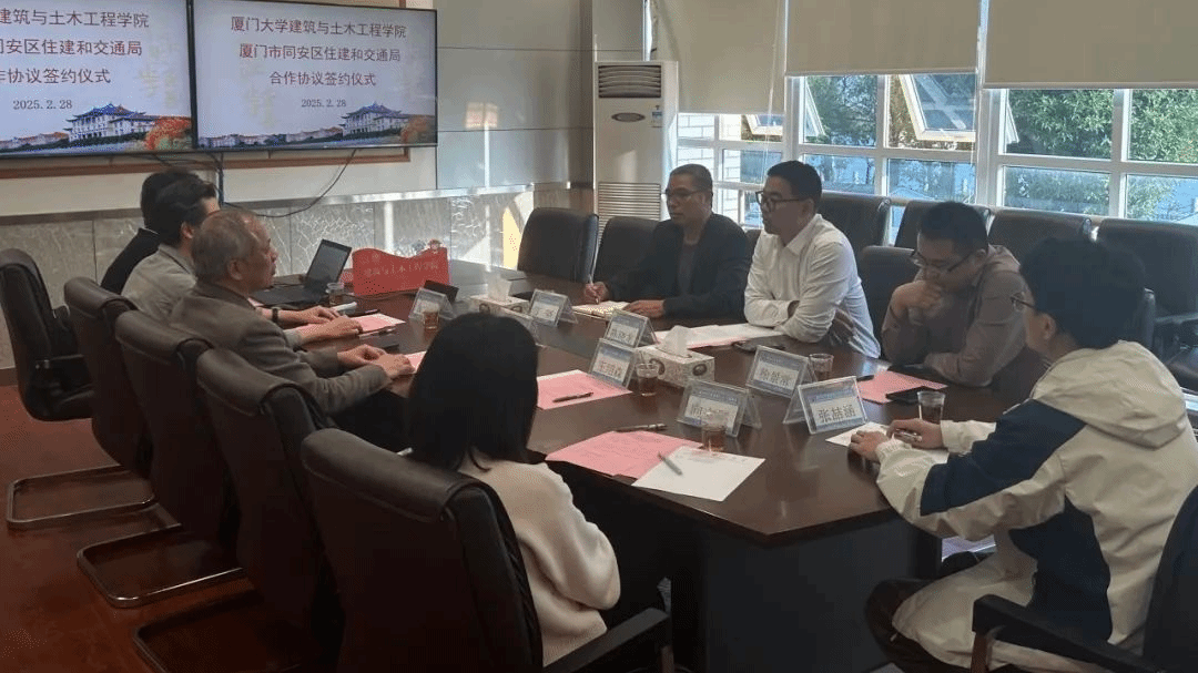 2月28日下午,厦门市同安区住建和交通局与厦门大学建筑与土木工程学院合作协议签约仪式在我院208会议室举行。厦门市同安区住建和交通局副局长陈晓龙、建设事务中心主任徐景常、建设事务中心书记丁坚,厦门大学建筑与土木工程学院院长张建霖、建筑系助理教授向立群、张喆涵参会,签约仪式由建筑系教授黄庄巍主持。