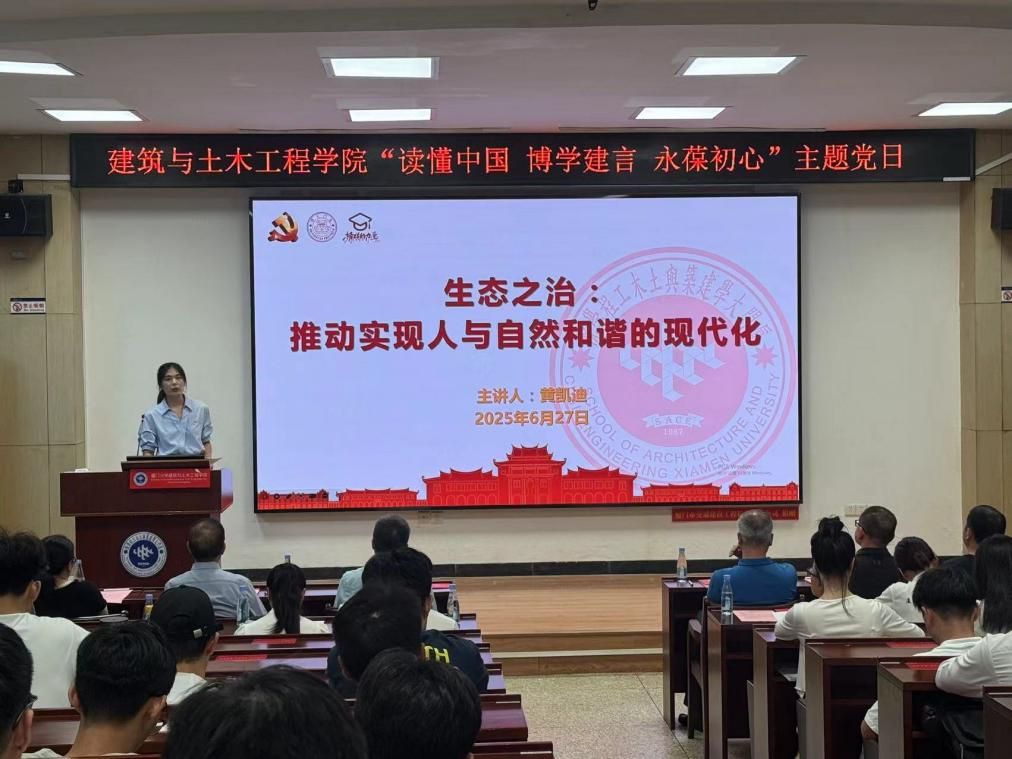 黄凯迪以 “生态之治:推动实现人与自然和谐的现代化” 为主题分享,指出中国式现代化是人与自然和谐共生的现代化。她从四个时期回顾我国生态文明建设历程,用2024年相关数据及厦门国土空间规划、筼筜湖生态修复等案例,展现生态建设成果,强调国土空间规划对践行生态文明思想的重要性。