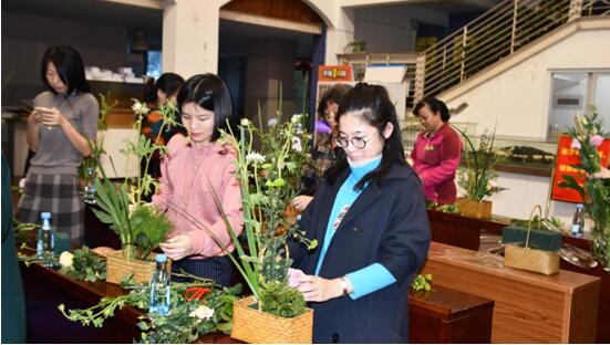 黄宝兰老师首先向大家介绍了中国花艺入门的基础知识。古人语“桃之夭夭,灼灼其华”,中国自古便有以花祭祖和互赠花枝的习俗,文人墨客寄情花草、折枝的兴致经久不衰,而插花艺术既具自然的写真洒脱,又具素雅知性的文人气息,相当符合中国传统文化的风格。之后,在黄宝兰老师的悉心指导下,在场各位建筑与土木工程学院的女老师纷纷亲自动手,完成精致巧妙又各具特色的花艺作品。大家在欢乐和融洽的气氛中度过了“三八女神节”。