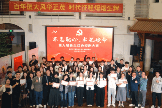 11月23日晚,建筑与土木工程学院第九届“不忘初心、牢记使命”红色短剧大赛在厦门大学思明区校区曾呈奎楼落幕。大赛以深入学习贯彻党的二十届四中全会精神、纪念中国人民抗日战争暨世界反法西斯战争胜利80周年为主线,深切缅怀为民族独立与人民解放事业英勇牺牲的革命先烈。学院党委副书记刘建敏,2025级新生班主任张航华,党务秘书郑建斌,团委书记刘涛,团委副书记陈韬澜及全体新生辅导员出席活动,2025级全体新生、学生党支部代表共100余人现场观摩。