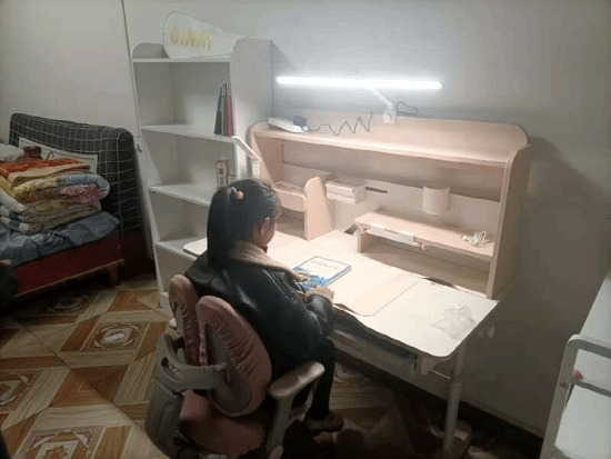 冬日的宁夏永宁县闽宁镇,阳光透过窗子,照在新安装的可调节高度的书桌上。护眼台灯泛着柔光,收纳柜里整齐摆放着课外书。这个房间属于一对11岁的双胞胎姐妹——曾经,她们只能挤在客厅茶几上写作业,如今有了属于自己的“筑梦房”。姐妹俩坐在新椅子上,兴奋地转动着可调节椅凳。