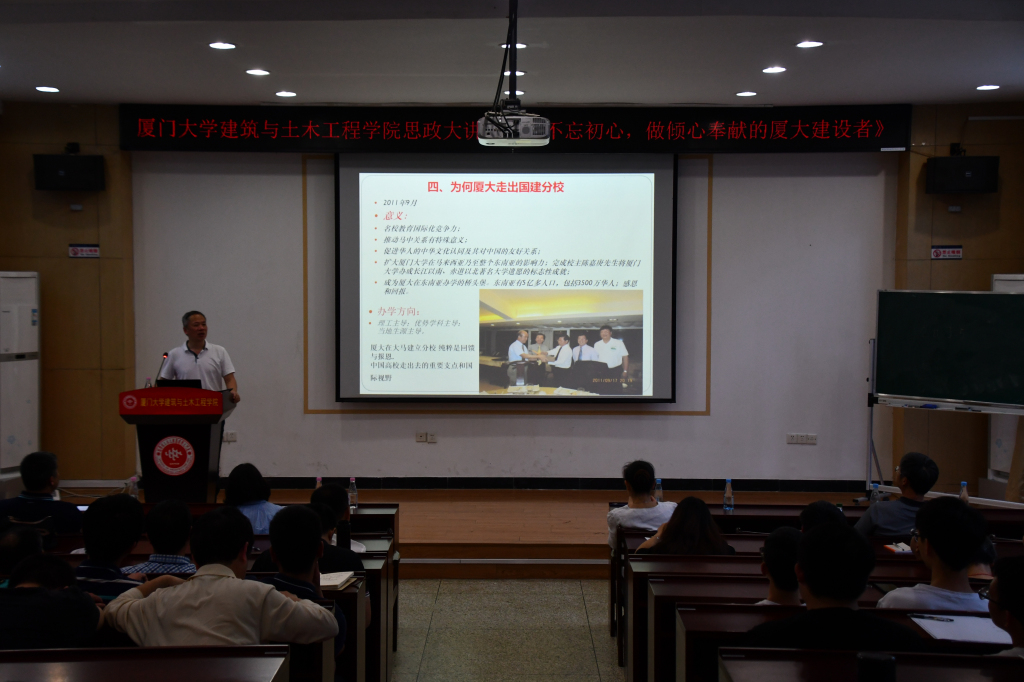 张建霖从习近平主席对当代青年的寄语、共产党历史、厦门大学历史和厦门大学马来西亚校区建设等四个方面为主线给大家上了一堂生动的思政课。他指出,厦门大学马来西亚校区的建设既是中国高等教育“走出去”的一项重要举措与探索,也是对加强中马两国间教育与文化合作发展的具有重要的战略意义,还是积极响应国家“一带一路”建设的示范工程,处处体现着对成就陈嘉庚先生的马来西亚的“历史回馈”和“对陈嘉庚先生、对马来西亚的一种感恩”。