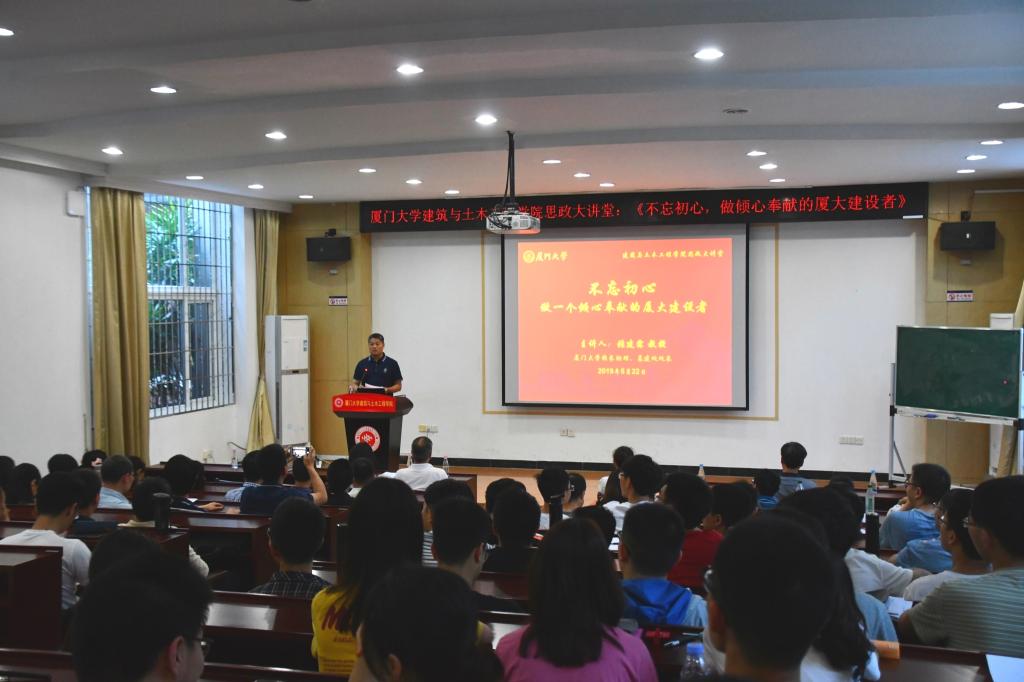 2019年5月22日下午,建筑与土木工程学院“我和我的祖国”系列活动暨思政大讲堂《不忘初心,做一个倾心奉献的厦大建设者》专题报告在曾呈奎楼118报告厅顺利举行。校长助理、校基建处处长张建霖教授,建筑与土木工程学院党委副书记王瑛慧、黄俊清,基建处副处长、党支部书记张晓芸,土木工程系主任古泉,系副主任、系教工党支部书记高婧,系副主任张建国,基建处、土木工程系全体老师,以及土木工程系2017、2018级的全体研究生参加此次活动。此次活动由土木工程系教工党支部、基建处教工党支部承办。