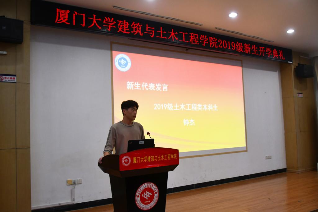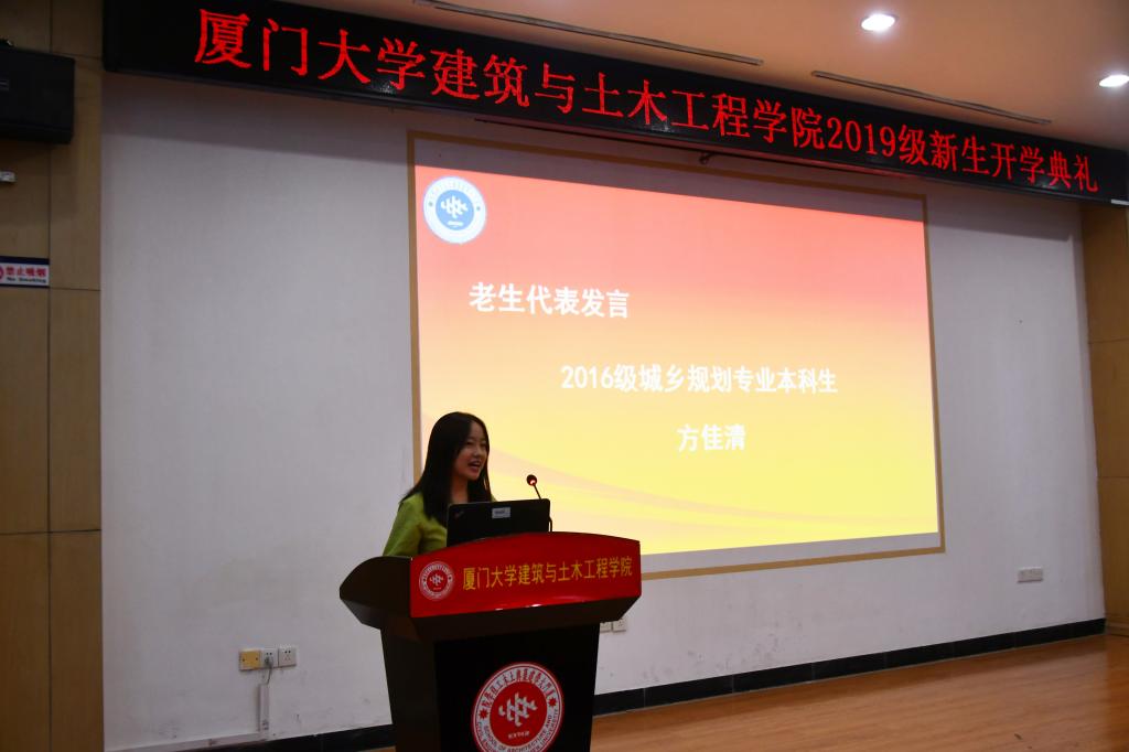 最后,学院学生会主席、城市规划系2016级本科生方佳清、土木工程系2019级本科生钟杰分别代表老生和新生上台发言。方佳清同学回望过去,讲的是自律与担当,谈的是坚持与梦想;钟杰同学放眼当下,说的是感谢与希望,许的是承诺和未来。