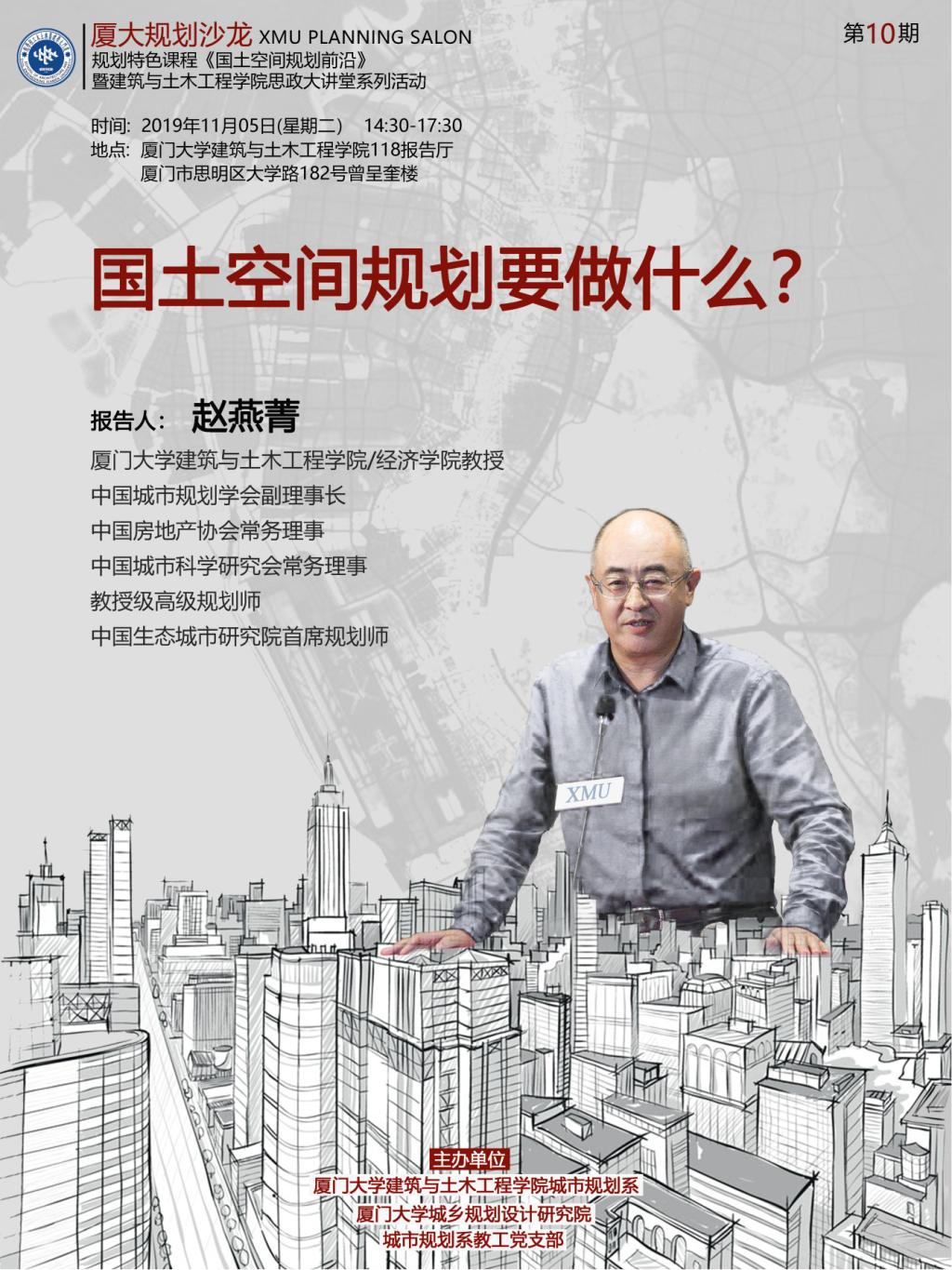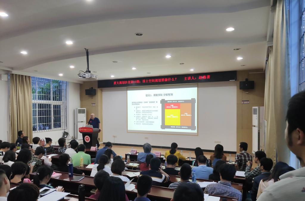 2019年11月5日下午,厦门大学建筑与土木工程学院城市规划系学术沙龙暨思政大讲堂系列活动第10期在曾呈奎楼118报告厅隆重举行。建筑与土木工程学院城市规划系教授赵燕菁作题为《国土空间规划要做什么》专题报告。出席本次讲座的嘉宾有厦门市交通运输局副局长任国岩、厦门城市规划学会王伟会长,厦门市规划界人士及城乡规划系全体师生等。本次沙龙由规划系副系主任(主持工作)杨哲主持。