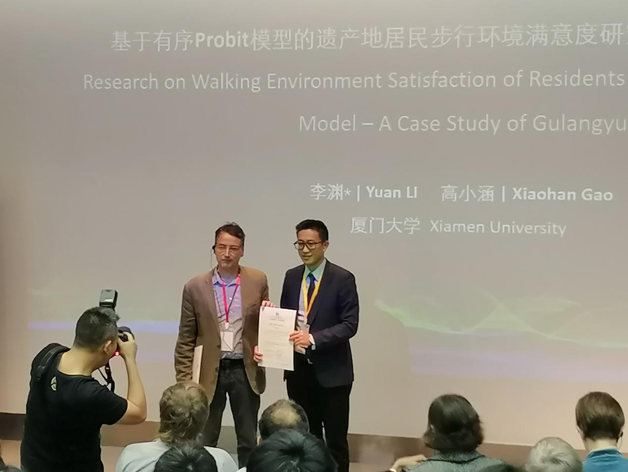 我院建筑系李渊教授、2015级城市规划系黄竞雄及2015级建筑系硕士研究生黄文灿参加了此次会议,并分别作题为“基于有序Probit模型的遗产地居民步行环境满意度研究——以鼓浪屿为例”、“绿视衰减曲线:文化遗产街区步行环境绿视率测度与评价”(报告人:黄竞雄)的报告。论文“基于有序Probit模型的遗产地居民步行环境满意度研究——以鼓浪屿为例”被评为会议最佳论文,由联合国教科文组织亚太地区世界遗产培训与研究中心(上海)副主任Dr. Simone Ricca颁发获奖证书。