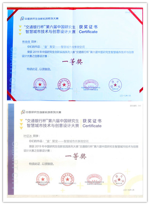 团队介绍:梁婷越、焦晓倩、丁祥明、叶征冰四位研究生共同完成的作品《“盒”聚变——智慧城市共享微空间》结合了微空间的尺寸需求,选取10英尺标准集装箱作为共享盒子的载体,并在其中置于多种功能,不同功能的盒子对应不同的颜色。共享盒子是集环保、经济、模块化为一体的全新概念构筑物,以轻钢为骨架、夹芯板为围护材料,以标准模数进行空间组合,构件采用螺栓连接,方便组装和拆卸及整体移动运输,满足了通用标准化、环保节能化、快捷高效化的需求。该作品参加第六届中国研究生智慧城市技术与创意设计大赛获得全国一等奖,厦门大学获得本次大赛“优秀组织奖”,创我校历届参赛的最好成绩!