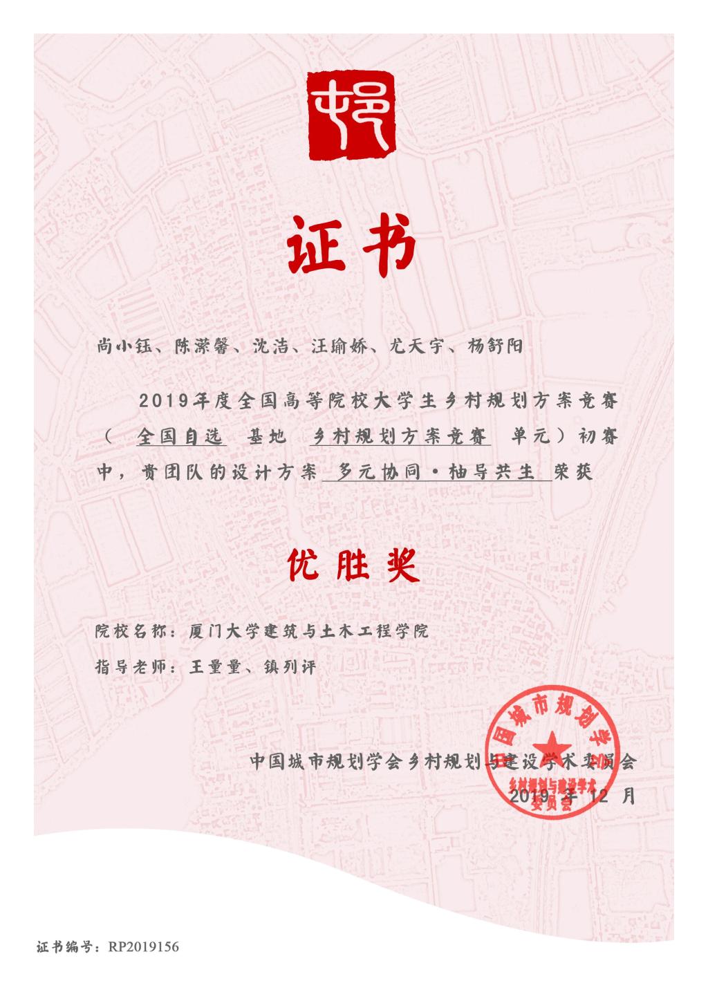 团队介绍:在目前的乡村振兴背景下,中国乡村类型据此分为四类,该团队选择“钟腾村”来代表集聚提升型乡村,希望通过规划设计和产业策划来为全国的同类型的集聚提升型乡村进行乡村振兴提供借鉴。在对实地进行深入调研的基础上,通过探讨钟腾村的发展根本性问题,以产业为切入点,提出乡村共生圈理论,通过构建乡村制度、产业、空间和人文四个层面之间的循环共生关系,来使得乡村形成有机整体,提升乡村共生力。产业策划上,突破以往传统的大而空的规划模式,以钟腾村产业问题这一根本痛点为中心,从钟腾实际的蜜柚产业出发来制定产业目标、确定产业发展定位以及多产融合发展的体系,并给出了完善且可行的制度创立方案、市场策略、保障措施、项目策划以及项目进度安排等分布落实的相关内容。在乡村规划年会中,该产业策划成果也得到了评委的“凝练了乡村真问题,发展策划逻辑清晰,可行度高”的好评,并作为优秀成果在年会上展出,最终,该方案获得2019年度全国高等院校大学生乡村规划方案竞赛决赛全国第二名、二等奖的优异成绩。