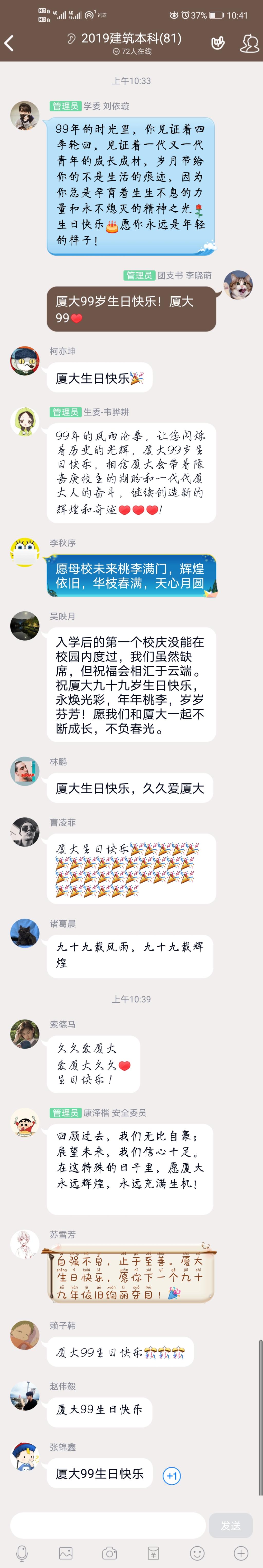 九十九载风雨兼程,九十九载青春如歌,百年学府经风雨,几般迁移岁月稠。自强!自强!学海何洋洋!谁欤操钥发其藏?芙蓉湖畔,嘉庚楼前,共同成长。自强不息,止于至善,早已与上弦场清亮的月光、白城海滩跃动的浪花一同深深地刻在每个厦大人的记忆之中。今日作为厦大学子,衷心地祝我们的厦门大学九十九岁生日快乐!