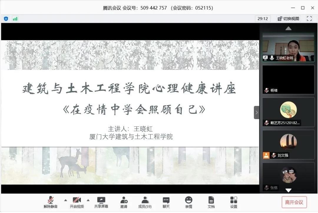 经过了漫长的居家学习,再加上返校后的环境变化适应,同学们们面临着因疫情带来的情绪变化,为了能让毕业班同学更好地理解生命意义,调适情绪与心态,积极投入生活、学习,5月21日下午,建筑与土木工程学院特邀厦门大学签约心理咨询师、约聘督导师王晓虹作题为《在疫情中学会照顾自己》的心理健康讲座,参会对象为我院2020届全体毕业生。