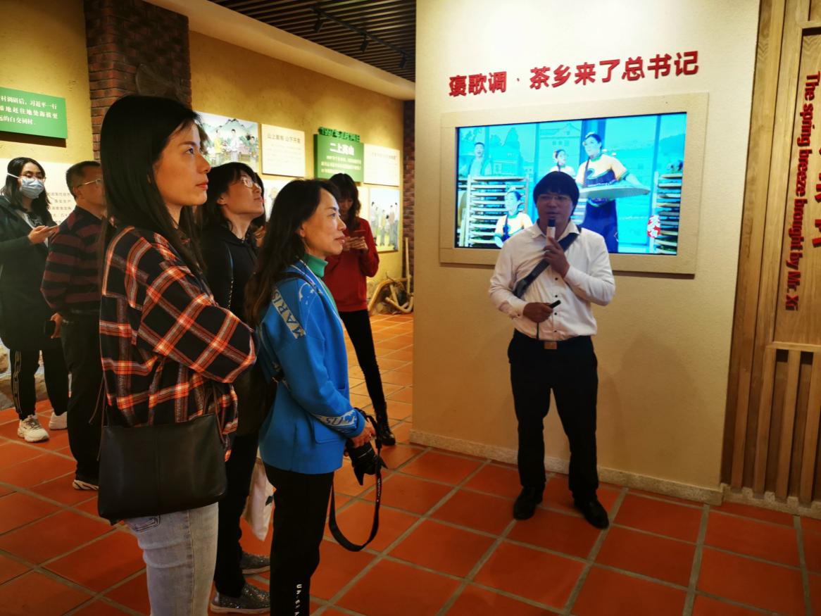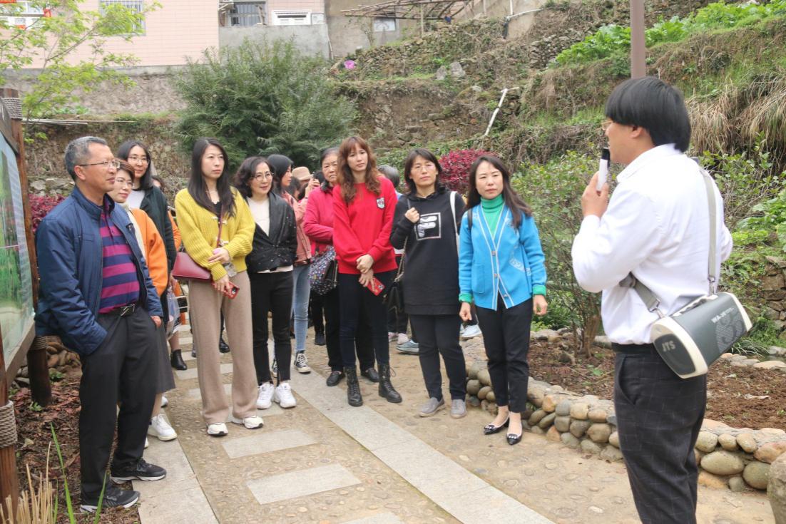 正值春暖花开的季节,绕过十八弯的山路,清洌的空气与满山的碧绿,教师们在这里邂逅了春天。白交祠村的党支部副书记杨财穆带领大家先后参观白交祠村观景平台和“山上戴帽,山下开发”纪念石柱,之后沿着蜿蜒的中心溪叠水步道,穿过婆娑的竹林,教师们登上海拔985米的光明顶,白交祠村错落有致的茶田尽收眼底,杨财穆向老师们讲述了这个昔日“地瓜当粮草,孩子当背包”的贫困小山村如何牢记习近平总书记的叮嘱,因地制宜走上脱贫致富路。
