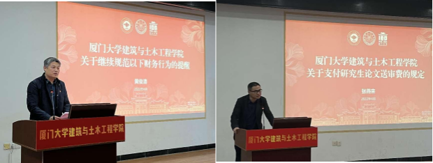 党委副书记黄俊清在会上作财务检查报告。副院长张燕来在会上就《厦门大学建筑与土木工程学院关于支付研究生论文送审费的规定(草案)》进行解读。