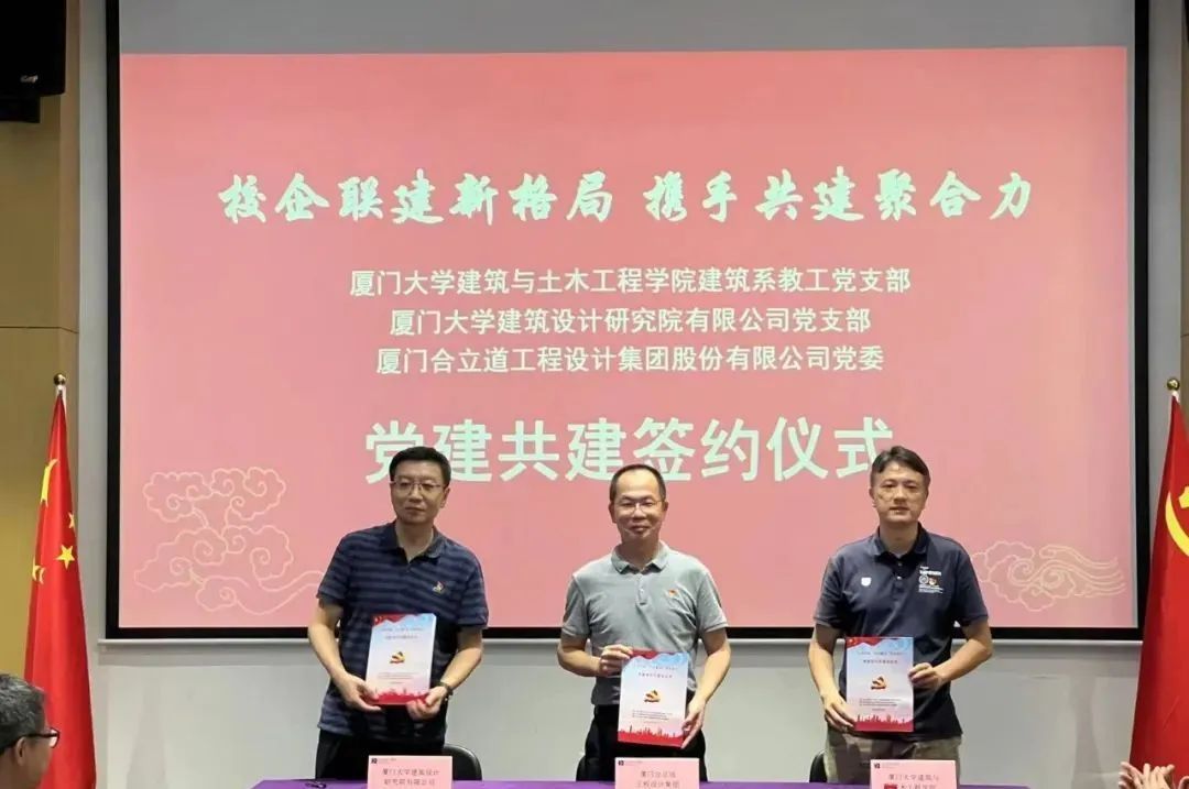 近日,建筑与土木工程学院建筑系教工党支部与厦门合立道工程设计集团党委、厦门大学建筑设计研究院有限公司党支部在合立道大厦二楼会议室举行三方党建共建签约仪式。会上,建筑与土木工程学院与厦门合立道工程设计集团签订了校企合作协议,并成立“研习基地”。
