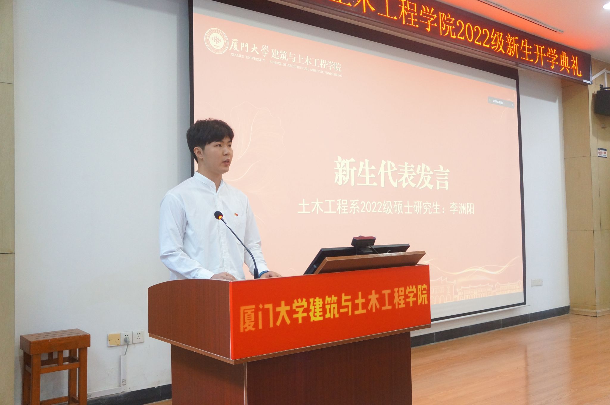 2022级土木工程系硕士研究生李洲阳作为新生代表发言。他向大家分享了自己的厦大梦以及满腔抱负:“我们身为厦大学子,不应沉浸在过去的成绩和上岸的喜悦中,要将过往沉淀,将成绩归零,在逆境中打磨自己的能力,把论文写在祖国的大地上。”