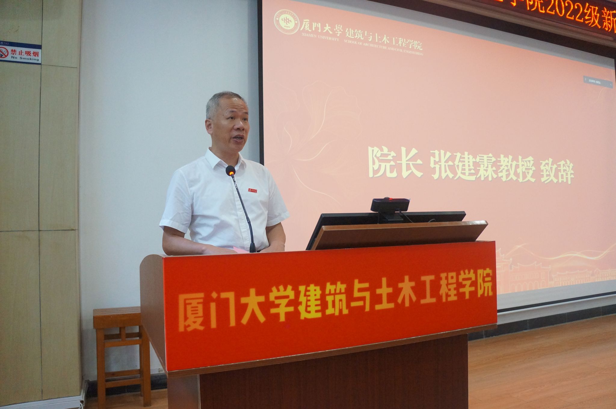 张建霖向2022级本科新生表示了热烈欢迎,介绍了厦门大学以及建筑与土木工程学院的发展历程,并向大家提出了殷切希望。他表示,希望同学们能秉承厦门大学的爱国精神、革命精神、自强精神、科学精神,立大志、明大德、成大才、担大任,传承红色基因,肩负一流大学一流学科的使命,与学院共同成长、共同创造辉煌。