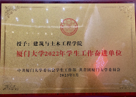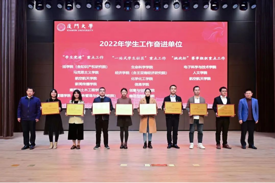1月8日,厦门大学2022年学生工作总结表彰大会在翔安校区西部片区3号报告厅举行。校党委副书记徐进功,校党委常委、组织部部长、统战部部长孙理出席会议。校关工委常务副主任赖虹凯在线上参与会议,各机关部门领导等出席会议。会议全面总结我校2022年学生工作的成绩和经验,表彰2022年学生工作先进单位、特色单位和先进个人。建筑与土木工程学院党委副书记王瑛慧、黄俊清,团委书记杨明伟,团委副书记林婕,辅导员赵晴晴参加会议。在大会上,学院获评“厦门大学2022年学生工作奋进单位”(“学生党建”重点工作)。