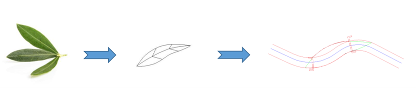 为了体现桥梁与当地特色结合的特点,桥梁取名为“榄枝桥”,以北溪村的主要作物橄榄为设计理念,从适用、经济、美观、安全、创新等方面进行设计。桥型平面以现实中橄榄叶的形状为原型,不断抽象和简化,得到从平面上看,在桥头处略细,桥跨中部较宽,两侧曲线过渡自然的“橄榄叶形”。榄枝桥方案选用空心板的结构形式,受力明确,避免了小半径曲线梁桥内外侧受力不均,扭矩过大造成外梁超载、内梁卸载等问题。