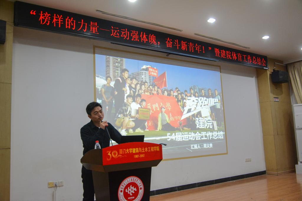 2019年12月11日晚上七点,厦门大学建筑与土木工程学院“榜样的力量”系列活动——"运动强体魄,奋斗新青年"体育达人分享会暨建院体育工作总结会在曾呈奎楼118报告厅成功举办。建筑与土木工程学院党委副书记王瑛慧老师、辅导员林婕老师出席了此次活动。