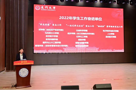 1月8日,厦门大学2022年学生工作总结表彰大会在翔安校区西部片区3号报告厅举行。校党委副书记徐进功,校党委常委、组织部部长、统战部部长孙理出席会议。校关工委常务副主任赖虹凯在线上参与会议,各机关部门领导等出席会议。会议全面总结我校2022年学生工作的成绩和经验,表彰2022年学生工作先进单位、特色单位和先进个人。建筑与土木工程学院党委副书记王瑛慧、黄俊清,团委书记杨明伟,团委副书记林婕,辅导员赵晴晴参加会议。在大会上,学院获评“厦门大学2022年学生工作奋进单位”(“学生党建”重点工作)。