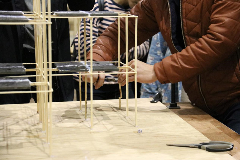 之后周开原在支部组织委员罗凌晖的协助下开始进行第一次加载演示。最初只加载了20kg,随后逐渐增加到50kg,每次加载演示间隔都以实例为大家介绍了如何提高结构的抗震能力,点出结构优化的可能方向。50kg加载轻松成功时,大家都给予了敬佩的掌声。学长随即演示了增强结构刚度和增设抗震缝等以防止模型扭转的方法。