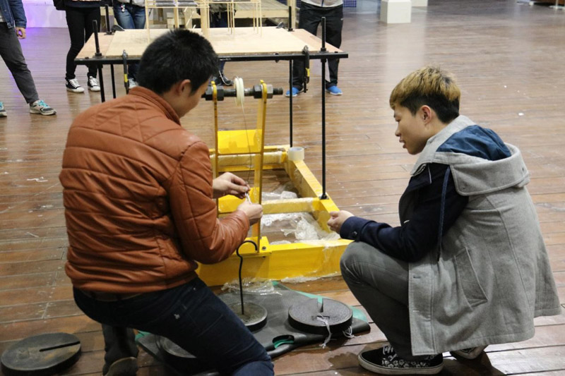 随后学长向各位学员介绍结构模型的加载要求与评分标准,并细心地告诫学员加载时的安全注意事项。大家都聚精会神地学习,对学长的结构模型表现出莫大的兴趣。