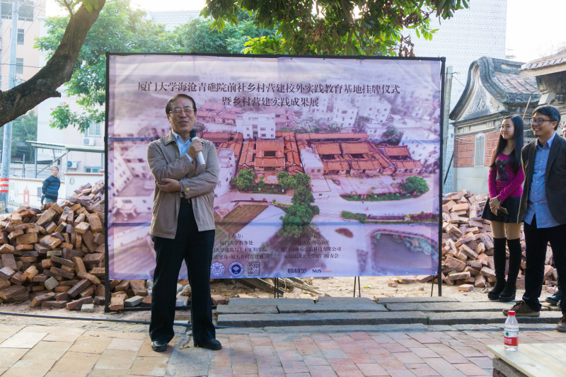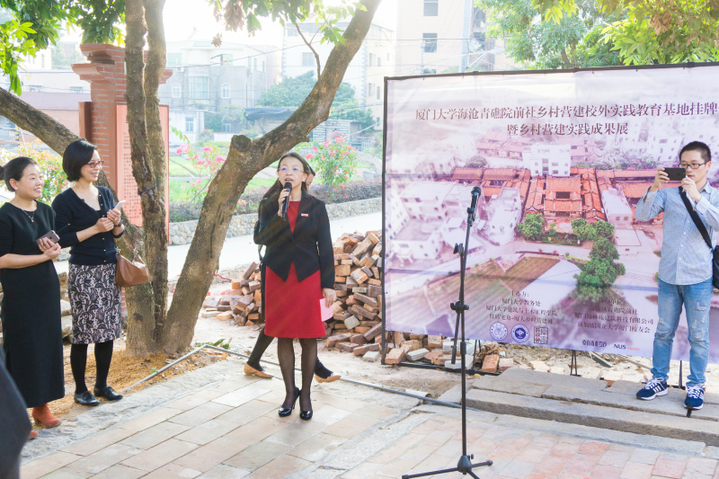 1月5日,“厦门大学—海沧青礁院前社乡村营建校外实践教育基地”在厦门市海沧区青礁村院前社举行揭牌仪式。副校长邬大光教授,校长助理张建霖教授、新加坡驻厦门总领事馆池兆森总领事、现代教育技术与实践训练中心主任、教务处副处长谢火木、中国城市规划院厦门分院李金卫院长、建筑与土木工程学院党政领导、师生代表及院前社项目各参建单位有关负责人出席了此次揭牌仪式。基地负责人、建筑与土木工程学院副书记黄宇霞主持揭牌仪式。