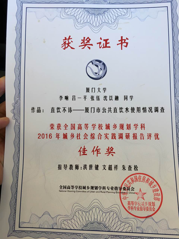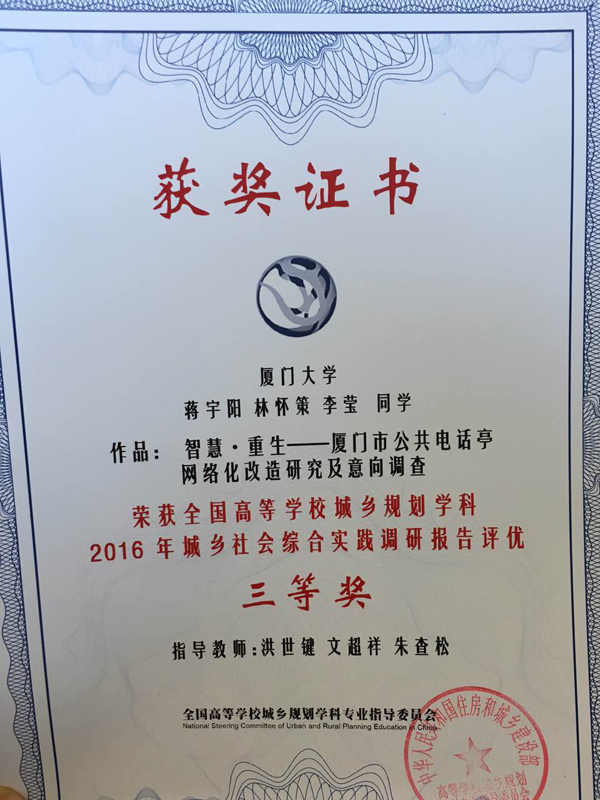 9月21日,2016中国高等学校城乡规划教育年会工作会议在西安召开,会议进行了全国城乡规划本科优秀作业评选。从建筑与土木工程学院城乡规划专业2012级本科生选送的五份社会调查报告,在“城乡社会综合实践调研报告课程作业评优”中,三份作品分获二等奖、三等奖与佳作奖。其中,由城乡规划专业文超祥,洪世键,朱查松三位老师指导的社会调查报告《基于社会距离的厦门市‘河南村’特征及维系机制调查》荣获二等奖,取得学院参赛以来的历史最好成绩;《厦门市公用电话亭网络化改造研究及意向调查》荣获三等奖、《厦门公共直饮水调查情况》荣获佳作奖,得到了来自全国高等学校城乡规划专业专家们的认可。
