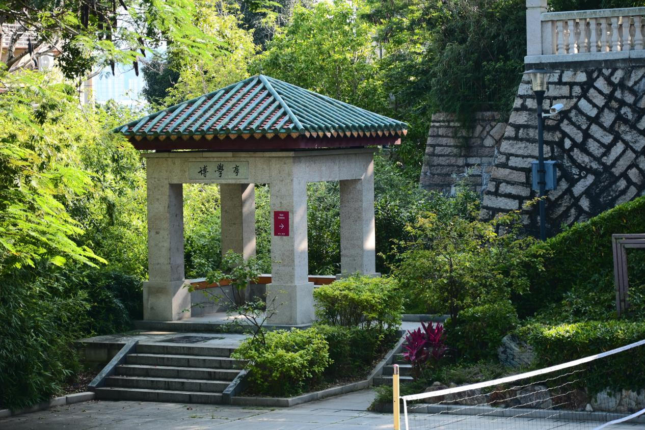 此亭位于公共事务学院一隅,与其他的亭子不同,是一座承担纯粹纪念意义的碑亭,亭子中立有一块石碑,上面书写了部分捐赠记录。从亭子形制上来看此亭也与众不同,虽是四角方形石亭,但其亭盖却如同寻常中国传统木构建筑的屋盖一般做成了歇山式,歇山式屋顶共有九条屋脊,即一条正脊、四条垂脊和四条戗脊,因此又称九脊顶。其结合了直线和斜线,在视觉效果上给人以棱角分明、结构清晰的感觉。