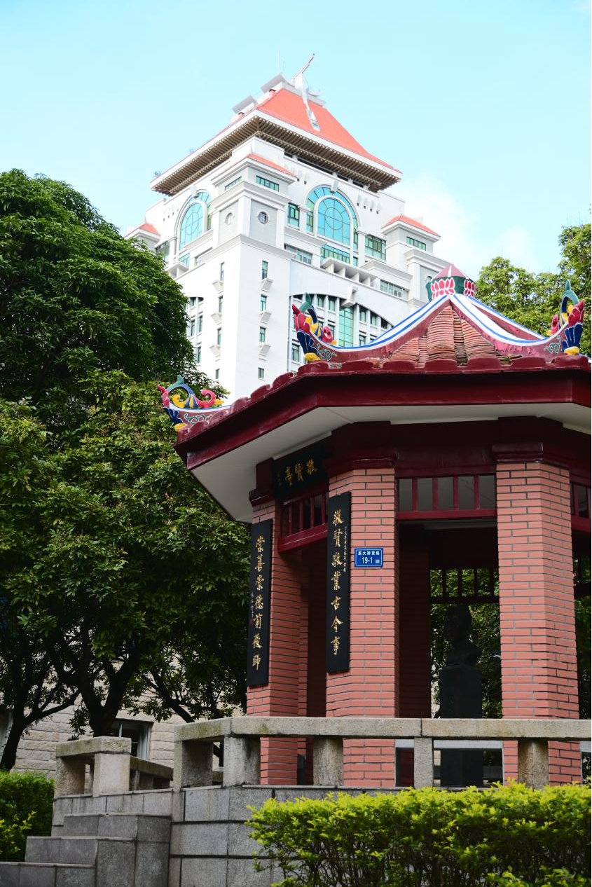 在建筑形制上,同样是“穿西装、戴斗笠”的整体风格,但敬贤亭与文庆亭又有所不同。此亭为八角攒尖亭,作为“斗笠”的亭盖部分中国传统建筑风味更为浓郁,采用了重檐翘角,作水戗发戗式样,戗脊与屋角都绘以艳丽的青红色,生机勃勃,富有闽南传统建筑色彩。亭身部分也不同于文庆亭,不设拱券而是做成了砖砌柱,用以支撑亭盖。敬贤亭整体风格方正而又不失俏皮,座落在单层台基上,经由几步台阶就可以抵达,周围绿树环绕、书声琅琅、颇为秀美,吸引了不少老师、同学、游客驻足停留。