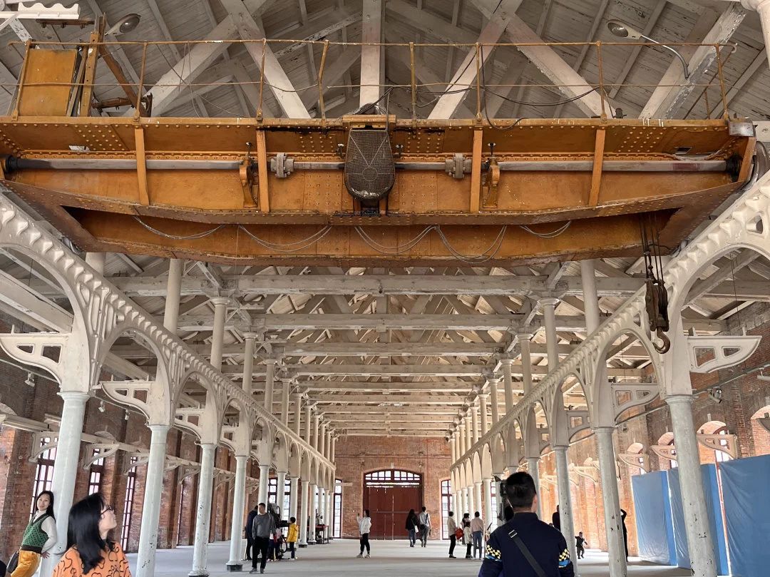 铁胁厂原结构钢材生产于约120年前,具有很高的文物价值,将原铁胁厂的主要构件以“展品”的形式进行保存。对于锈蚀较轻的钢结构构件,采用表面清理再喷涂透明阻锈剂的方式进行处理,最大化的展示原有构件的历史记忆。对锈蚀严重的钢柱,采用贴焊钢板的方式进行加固,焊接完成后,柱脚位置进行混凝土外包,其他位置采用外刷透明阻锈剂进行处理。同时对于原有钢构件上遗留的不同时期工业生产的附属构件如电风扇、吊车、设备管道等均最大程度地保留下来,以展示船厂时期工业生产的印记。还用雕塑还原了工人们在自制铁胁和飞机装配车间的场景,展示了船政从木船向铁胁跃进、从造舰向航空跃进的历程,显示了船政人与时俱进、紧追科技新潮的精神。