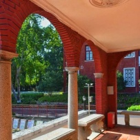 建筑正面设有连续的圆拱廊道,采用白色立柱支撑,赋予立面韵律感,同时增强空间的通透性。