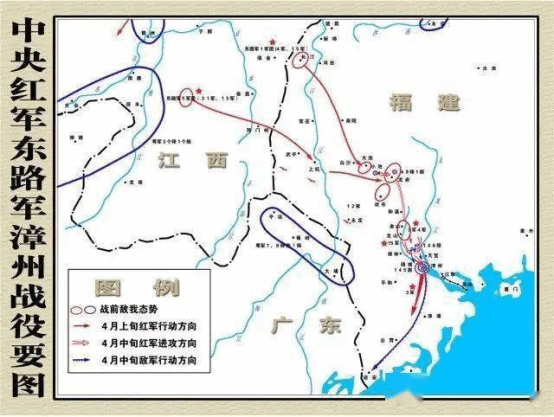 1932年4月初,红一军团从长汀出发,红五军团从赣南出发,4月10号攻下龙岩城后汇合,向漳州开进。红军本着“避实击虚”的方针,于4月20号顺利打下漳州,缴获大量武器装备,包括两架飞机。这是中央红军远离根据地集中兵力外线作战的一次成功战例,是毛泽东军事思想的一次伟大胜利。