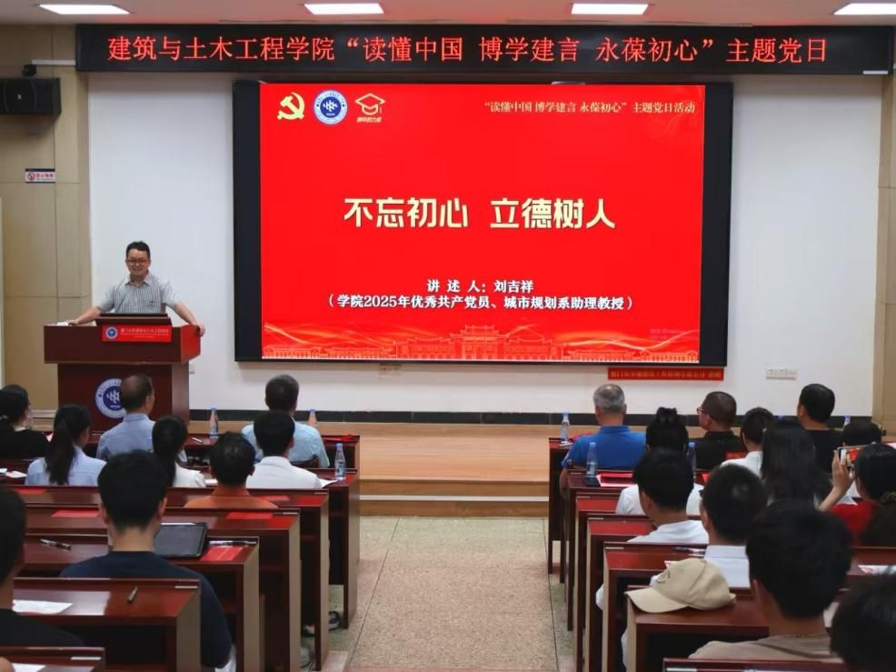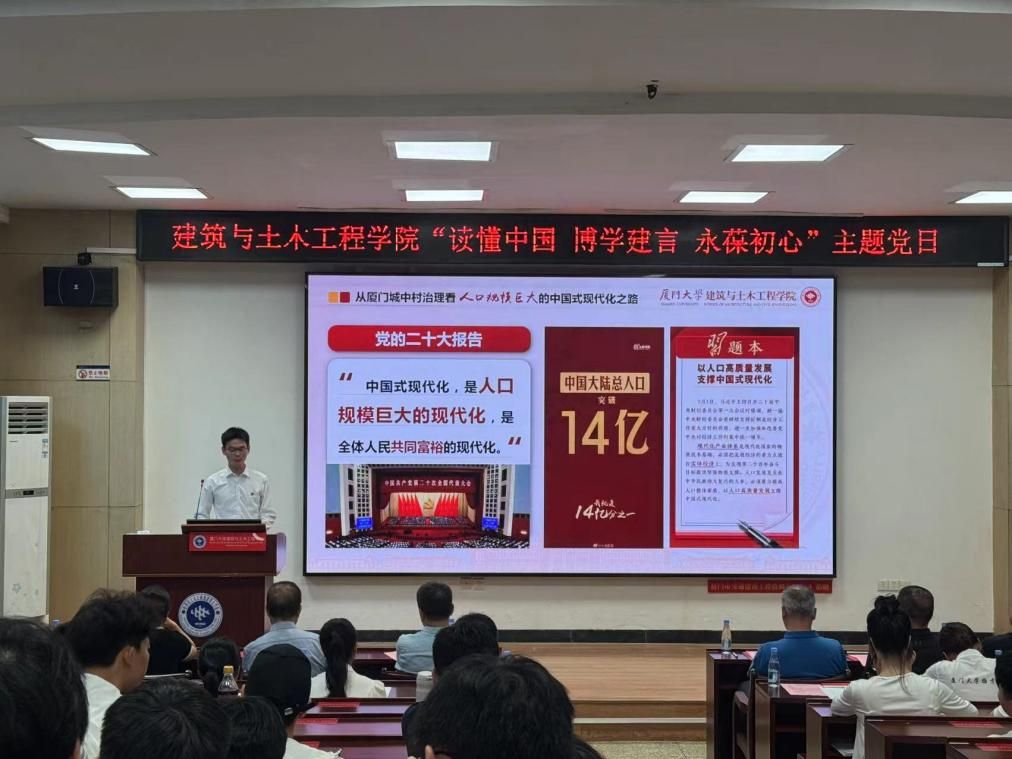 为迎接中国共产党成立104周年,6月27日下午,厦门大学建筑与土木工程学院举办“读懂中国、博学建言、永葆初心”主题党日活动。该活动是学院“读懂中国”系列活动的第八期,也是“榜样的力量”系列活动之一。出席活动的嘉宾有校基层党建联络员邱七星,学院关工委常务副主任陈和祥,学院党委副书记、院长张建霖,学院党委副书记刘建敏、邹海燕,厦门大学扬才班学员代表,学院各党支部、团支部的老师同学。本次活动由2024级土木工程系硕士研究生范思盈主持。