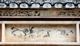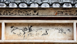 锦绶堂的墙也承载着丰富的艺术遗存,以精湛工艺与多元题材彰显深厚文化底蕴。外墙与庭院两侧屋檐下的青砖上,塑有用铜丝为骨架、桐油石灰为内胎、外涂彩漆的精美“檐画”,内容为《三国演义》、《杨家将》等戏剧人物故事及二十四孝人物,还有传统的中国山水、花鸟、兰梅荷竹,做工精致,画笔细腻。