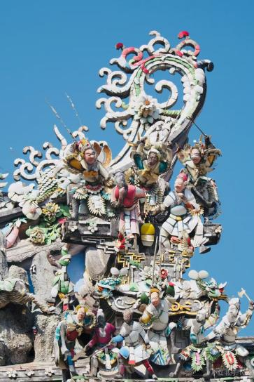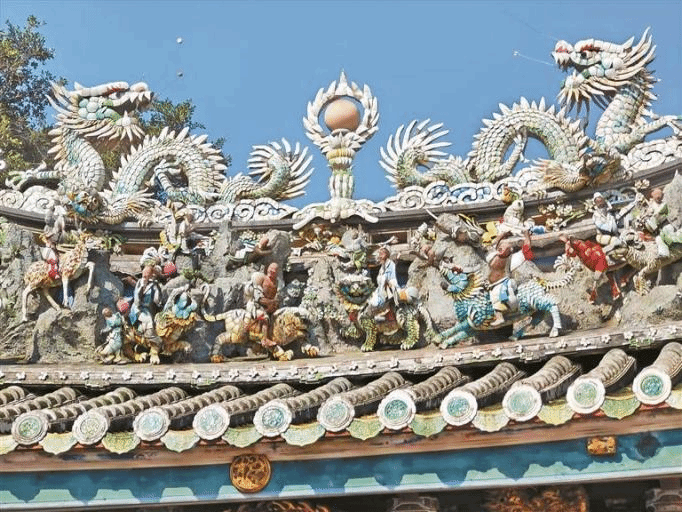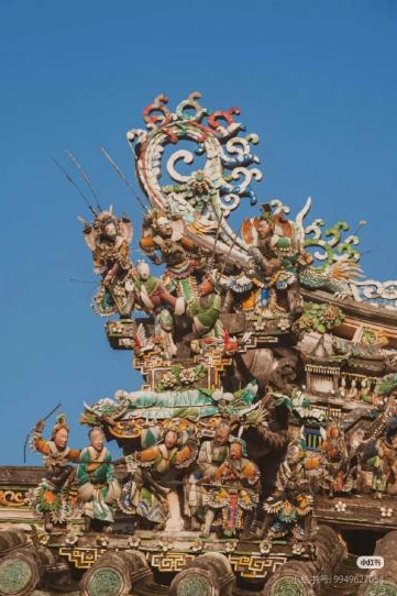 作为整座庙的 “颜值巅峰”,屋顶的剪瓷雕以大面积、高饱和度的色彩和立体造型,牢牢占据视线中心,堪称 “空中的非遗盛宴”: