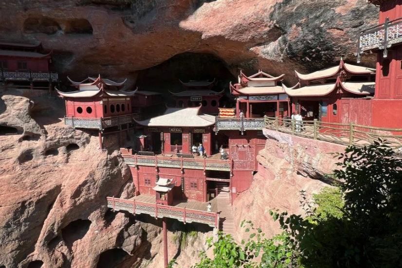 在福建泰宁的丹霞群山间,藏着一处“挂”在崖壁上的奇迹——甘露岩寺。当你循着青石板路走进峡谷,抬头便会撞见这座与赤色岩壁融为一体的古寺。整座建筑“借天不借地”,一半嵌入崖腹,一半凌空飞悬,仿佛从山石中自然生长而出,与缭绕的云雾相映,竟有种遗世独立的禅意。