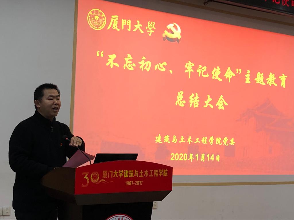 1月14日下午,厦门大学建筑与土木工程学院“不忘初心、牢记使命”主题教育总结大会在曾呈奎楼118报告厅召开。校第二巡回指导组副组长、校宣传部副部长楼红英出席并讲话。院党委书记刘梅作总结讲话。学院全体党委委员、学院行政领导,校基层党建联络员黄定基,工青妇负责人,学工组全体成员,全体党支部书记、支委,师生党员代表参加了会议。院党委副书记、院长王绍森主持会议。
