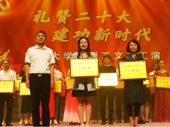 11月12日-13日,“礼赞二十大,建功新时代”厦门大学教职工文艺汇演在建南大会堂举行。全校共28支队伍参加比赛,竞显风采。经过精彩紧张的激烈比拼,我院选送的情景歌舞节目《理想耀南强》以总分第二的成绩荣获一等奖,学院荣获组织奖。