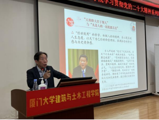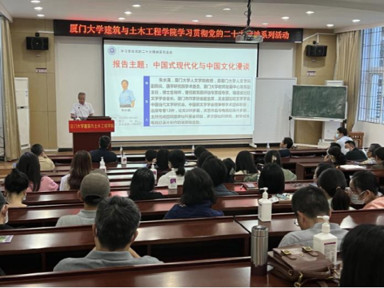 11月16日下午,建筑与土木工程学院学习贯彻党的二十大精神系列专题讲座在曾呈奎楼118报告厅举行。厦门大学中文系朱水涌教授为我院全体教职工作题为《中国式现代化与中国文化漫谈》的讲座,学院党委副书记、院长张建霖教授主持。