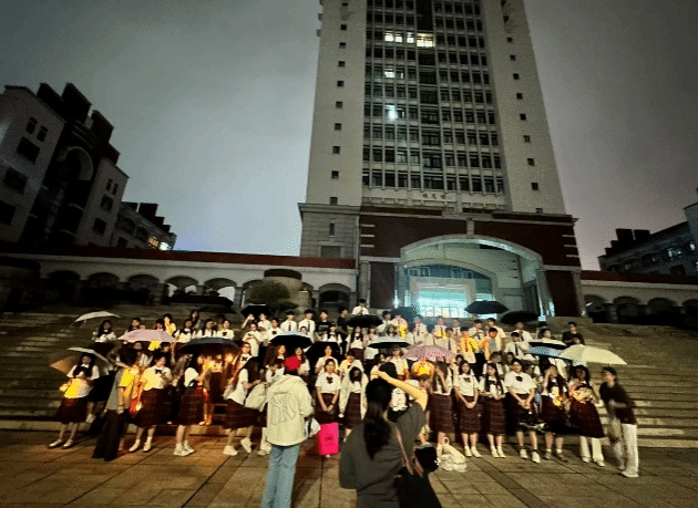 舞台上绽放的精彩瞬间,源自合唱团日复一日的刻苦排练。从分声部练习到队形联排,同学们始终保持着专注与热情,每一次音准的调整,每一处和声的磨合,都凝聚着大家对合唱节的重视态度。在排练过程中,同学们冒雨坚持,手中的星星灯闪烁着璀璨光芒,流畅悦耳的歌声伴随雨点,奏响了青年人象征明天的乐章。正式演出时,绚烂的晚霞与同学们精彩的表演交相辉映,令此次舞台 独具特色。